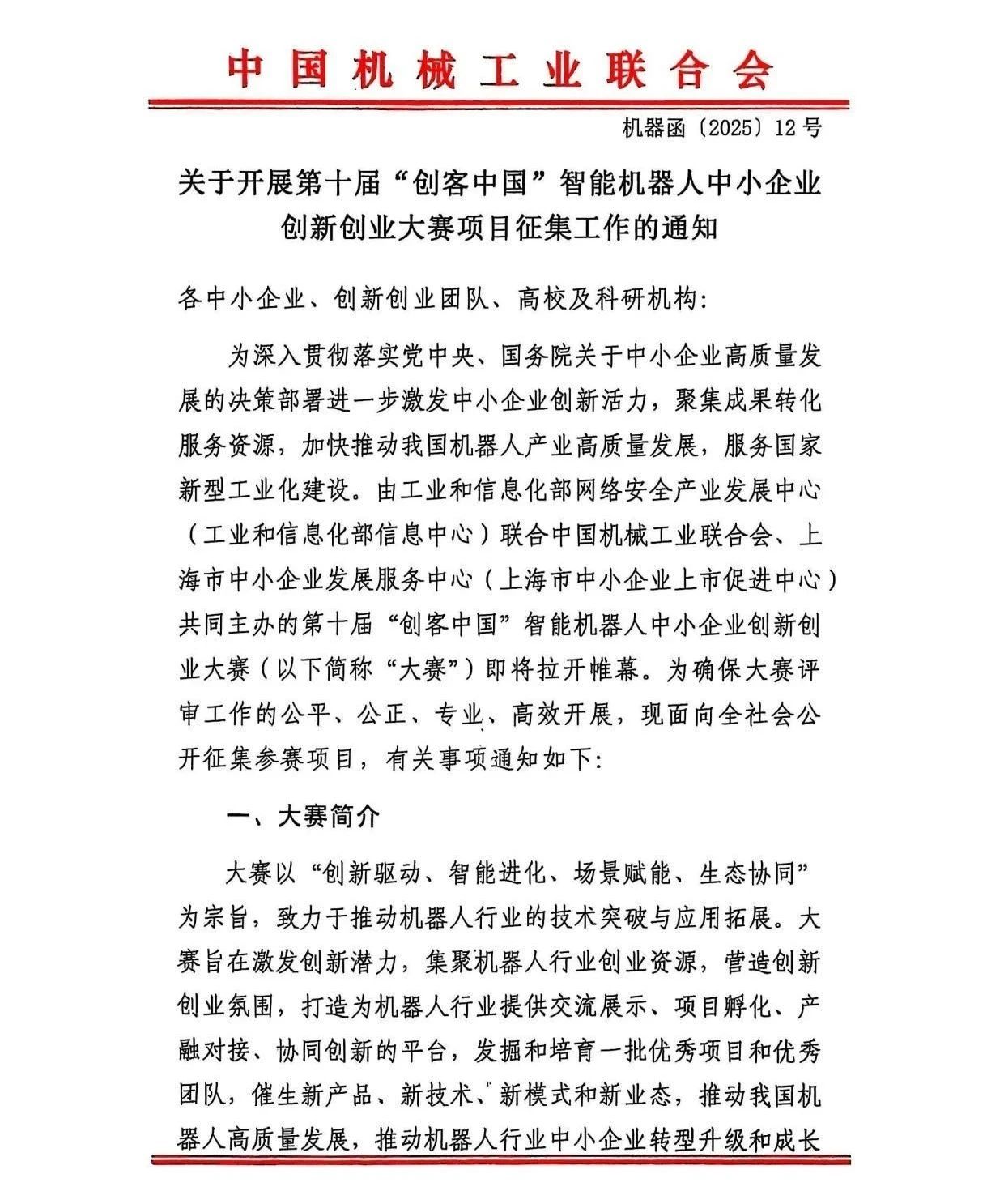 关于开展第十届“创客中国”智能机器人中小企业创新创业大赛项目征集工作的通知